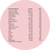 Ingredienser: Fyldemidler (microcrystallinsj cellulose, dicalciumphosphat, tværbunden natriumcarboxymethylcellulose), magnesiumoxid, L ascorbinasyre, DL - a - tocopherylacetat, ferrofumaral, nikotinamid, zinkoxid, calcium-D- pantothenat, overfladebehandlingsmiddel (hydroxypropylmethylcellulose, magnesiumsalte af fedtsyrer, fedtsyrer, talkum), antiklumpningsmiddel (siliciumdioxid), pyridoxinhydrochlorid, cuprisulfat, thiaminmononitrat, riboflavin, manganosulfat, retinylacetat, folsyre, natriumselenit, chrom(III)chlorid, kaliumjodid, natriummolybdat, D-biotin, choolecalciferol, cyanocobalamin.