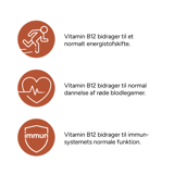 B12-vita­min bidra­ger til at redu­cere træt­hed og udmat­telse og til immun­sy­ste­mets nor­male funk­tion
