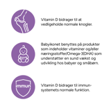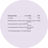 Ingredienser: Solsikkeolie (raffineret), majsolie (raffineret), Bifidobacterium animalis subsp. lactis BS01 (LMG P-21384), Limosilactobacillus reuteri LAB2PRO, Lacticaseibacillus rhamnosus GG ATCC 53103, D-vitamin (cholecalciferol), antioxidant (alfa-tocoferol).