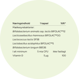 Ingredienser: Majsstivelse, pregelatineret majsstivelse, geleringsmidler (hydroxypropylmethylcellulose [kapsel], gellangummi), mælkesyrebakterier (Bifidobacterium animalis spp. lactis BIFOLAC™12, Lacticaseibacillus BIFOLAC™5, Bifodobacterium longum BB53), fructo-oligosaccharider (FOS), vitamin D (cholecalciferol), overfladebehandlingsmiddel (magnesiumsalte af fedtsyrer), antiklumpningsmiddel (siliciumdioxid).