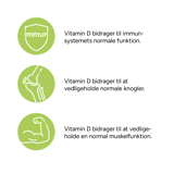 D-vitamin er med til at vedligeholde immunsystemet og dets normale funktioner samt bidrager til vedligeholdelsen af normale knogler og tænder