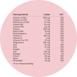 Ingredienser: Magnesiumoxid, fyldemidler (calciumcarbonat, mikrokrystallinsk cellulose, tværbunden natriumcarboxymethylcellulose), L-ascorbinsyre, ferrofumarat, overfladebehandlingsmidler (hydroxypropylmethylcellulose, talkum), DL-a-tocopherylacetat, nikotinamid, zinkoxid, calcium-D-pantothenat, antiklumpningsmidler (siliciumdioxid, magnesiumsalte af fedtsyrer, fedtsyrer),cuprisukfat, pyridoxinhydrochlorid, thiaminmononitrat, riboflavin, manganosulfat, retinylacetat, folsyre, chrom(III)chlorid, kaliumjodid, natriummolybdat, natriumselenit, cholecalciferol, cyanocobalamin.
