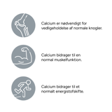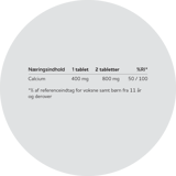 Ingredienser: Calcium (calciumcarbonat) fyldemidler (mikrokrystallinsk cellulose, tværbunden natriumcarboxymethylcellulose), overfladebehandlingsmidler (hydroxypropylmethylcellulose, talkum), antiklumpningsmidler (siliciumdioxid, magnesiumsalte af fedtsyrer), D-vitamin (cholecalciferol).