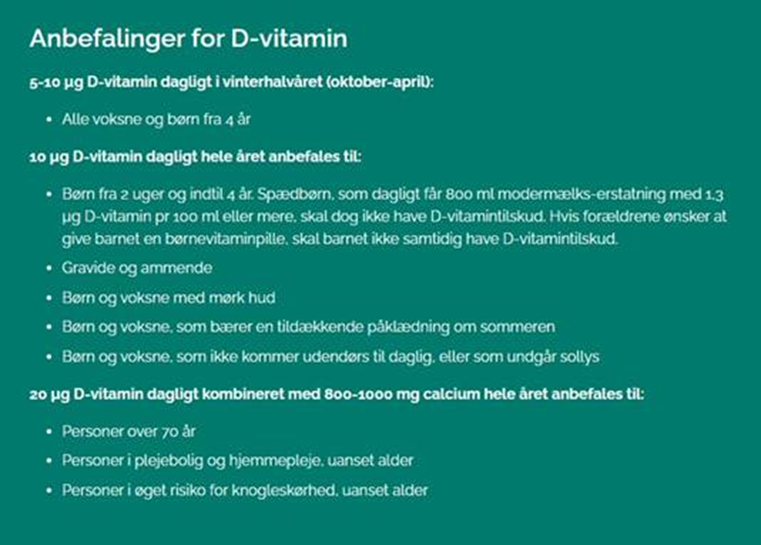 Fødevarestyrelsen anbefaler, at alle voksne og børn fra 4 år tager et tilskud af D-vitamin på 5-10 µg dagligt i vinterhalvåret (fra oktober til april). Dog er der dele af befolkningen, hvor der er yderligere anbefalinger for et tilskud af D-vitamin – se anbefalingerne herunder:
